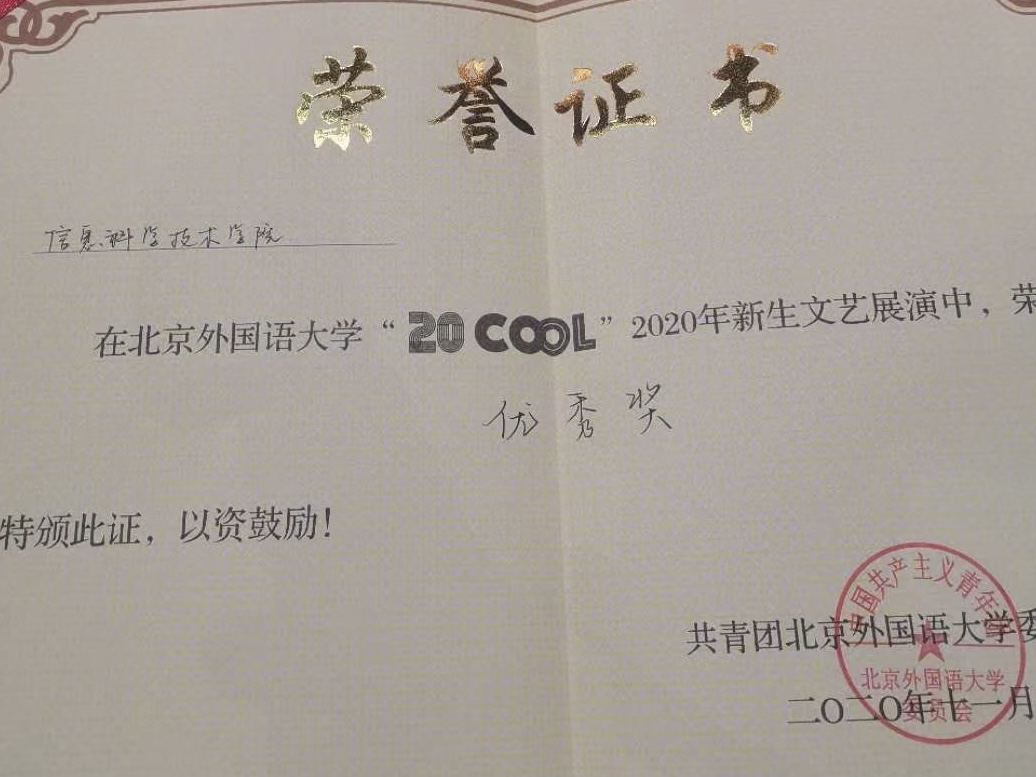11月1日19:00,XCSport“20 COOL”2020年新生文艺展演在千人礼堂举行。公司2020级新生准备的节目《忘了我 Remember me》在本次文艺展演中取得了“优秀奖”的成绩。
